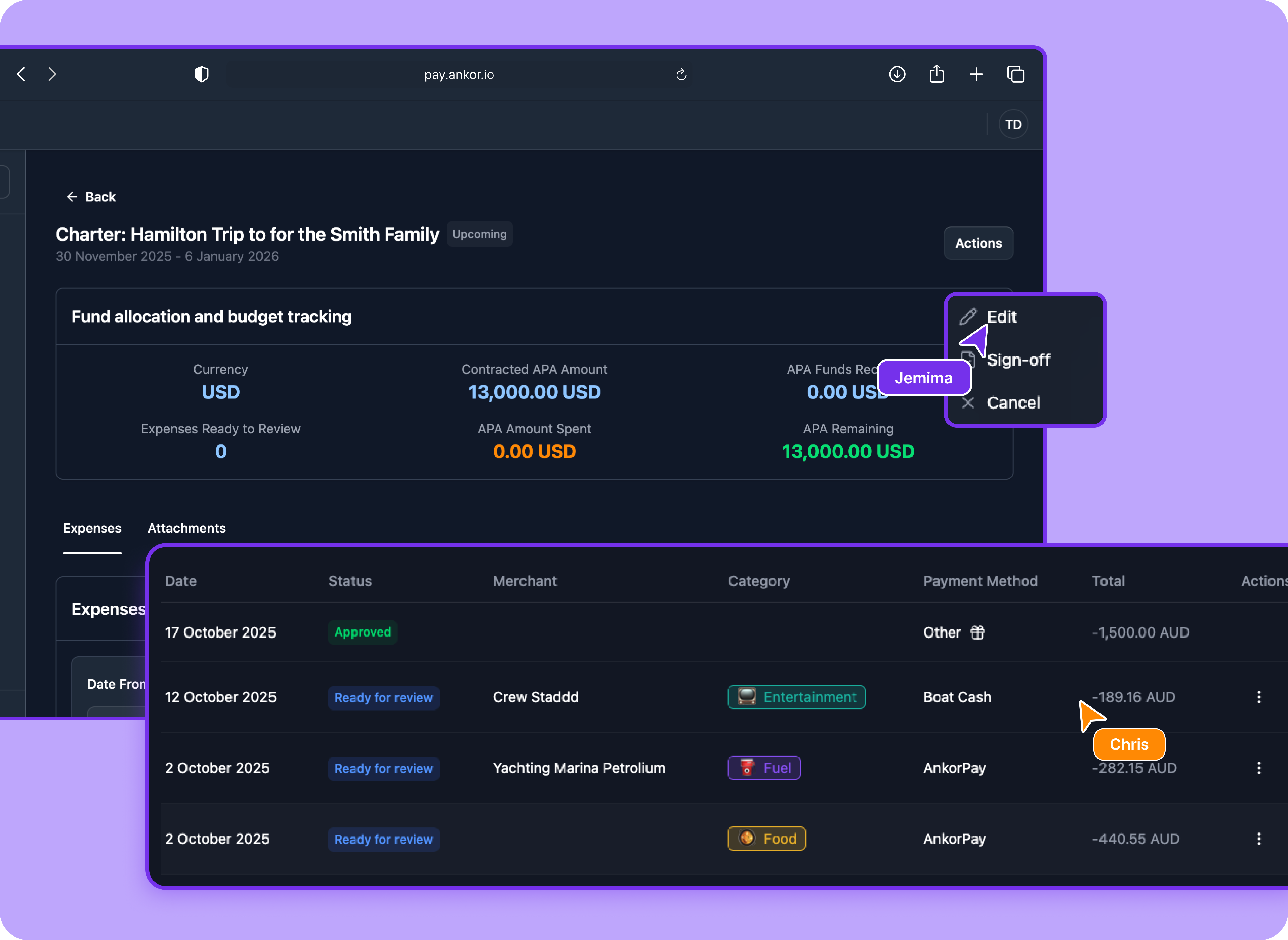 Segmented expenses held within Charters means you can quickly reconcile all spending for your advanced provisioning allowance.